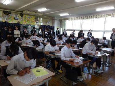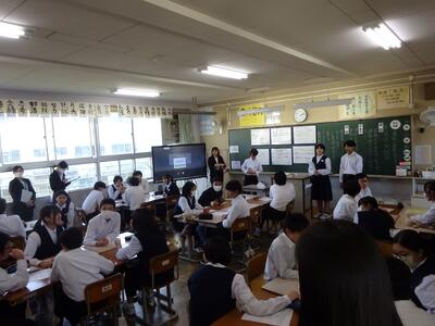 今日の5校時に2年2組で学級活動の研究授業が行われ、市内の多くの先生にご来校いただきました。