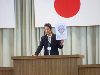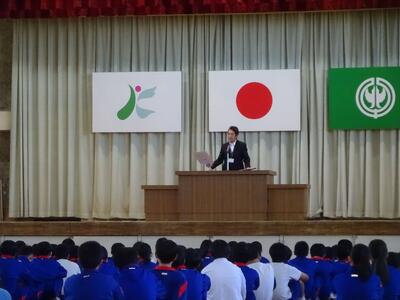 今朝は11月の全校朝会を行いました。校長先生が持っている絵はアートクラフト部のみなさんが描いたものです。