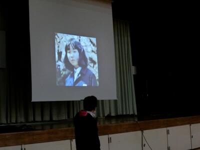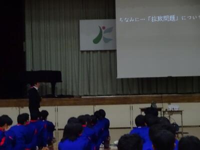 昨日の6校時に全校で人権集会を持ちました。今回は人権担当の先生からお話しをいただいたあと、全員で「めぐみ」を視聴しました。
