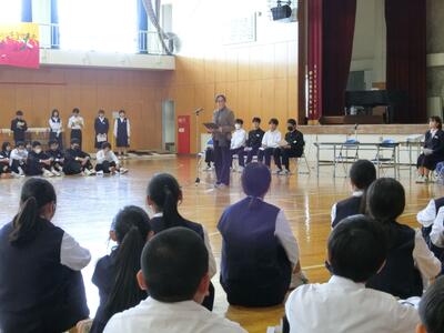 今朝は11月の全校朝会を行いました。校長先生が持っている絵はアートクラフト部のみなさんが描いたものです。